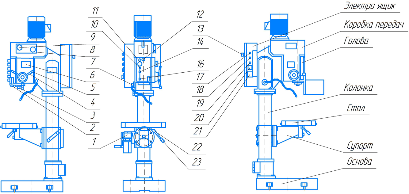 Переключение скоростей производится рукояткой, которая в зависимости от конструкции имеет четыре положения по окружности и три вдоль оси. Также переключение скоростей возможно при повороте переключателя на боковой панели (см. электрическую часть). Переключение подач осуществляется рукояткой, имеющей три положения по окружности и три положения вдоль оси. Рукоятки расположены на передней части сверлильной головки. Отсчет включаемых скоростей и подач производится по табличкам.